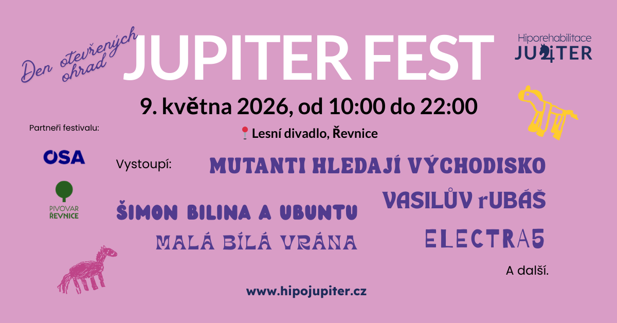 Festival na podporu hiporehabilitace Jupiter fest je oslavou 10 let spolku Hiporehabilitace Jupiter: setkání lidí, hudby, koní a dalších zvířat na jednom místě. Čeká vás celodenní akce v Lesním divadle uprostřed přírody, prostor pro setkávání, vystoupení kapel, koní, promítání, divadelní produkce pro děti, tvořivé dílny a workshopy pro děti. Denní část bude patřit rodinám a […]