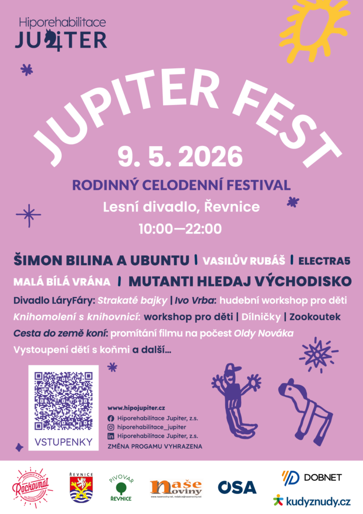 Jupiter fest je oslavou 10 let spolku Hiporehabilitace Jupiter: setkání lidí, hudby, koní a dalších zvířat na jednom místě.